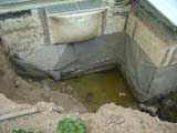 Sich einstellendes drückendes Grund- oder Schichtenwasser stellt nicht nur für das Gebäude sondern auch für die Eigentümer ein kompliziertes Problem dar. Nun heißt es auf der Grundlage der DIN 18195 Lösungsvarianten zu schaffen welche das Gebäude vor dem drückenden Wasser schützt und dem Eigentümer die ungehinderte weitere Nutzung seines Gebäudes gewährleistet. Auf Grund jahrelanger Erfahrungen auf dem Gebiet der Gebäudeabdichtung wurde für den Gebäudekeller des Einfamilienhauses eine Positivabdichtung aus bitumenverträglichen PVC-P Abdichtungsbahnen gemäß DIN 18195 Teil 6 gewählt. Das druckwasserhaltende in sich geschlossene Abdichtungssystem wurde in Form einer schwarzen Wanne über den Kelleraußenwänden und der vorhandenen Stahlbetonbodenplatte angeordnet und durch verschiedene genormte Abdichtungselemente ergänzt. Seit 2006 steht der Gebäudekeller im Grundwasser und es konnten bisher keinerlei Nachfolgeschäden durch von außen eindringende Feuchtigkeit festgestellt werden. Die Abdichtungsmaßnahme stellt somit einen Erfolg für den Planer und den Eigentümer dar.